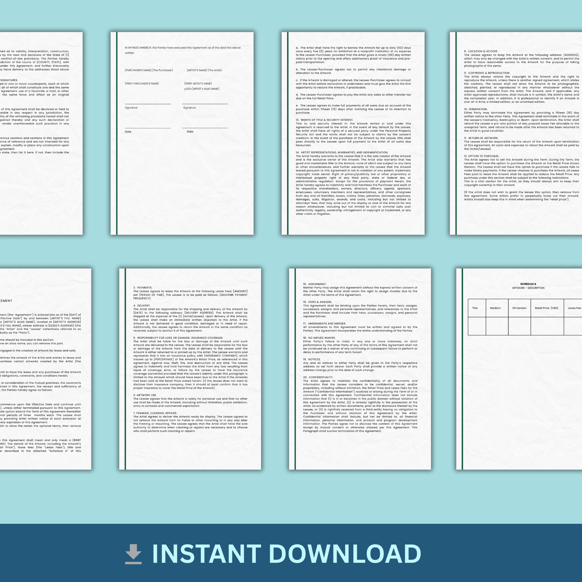 This Art Leasing Agreement establishes the terms of the relationship between the artist and the renter. This Agreement clarifies the duration of the lease and lease fees. This Agreement also solidifies the leasee's obligations and duty of care for the artwork and provides the artist and the leasee with a framework for seamless collaboration in the art industry.