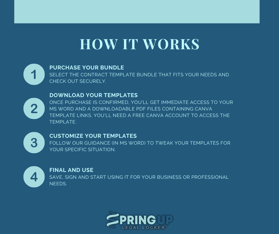 "Spring Up Legal Locker™ is owned by Spring Up Legal Locker LLC and is not a law firm or a lawyer. Nothing available for viewing or purchase on this website is legal advice and no attorney-client relationship is formed by purchasing or viewing any contract, template, product, course, guide, information, resource, tool available on this website.