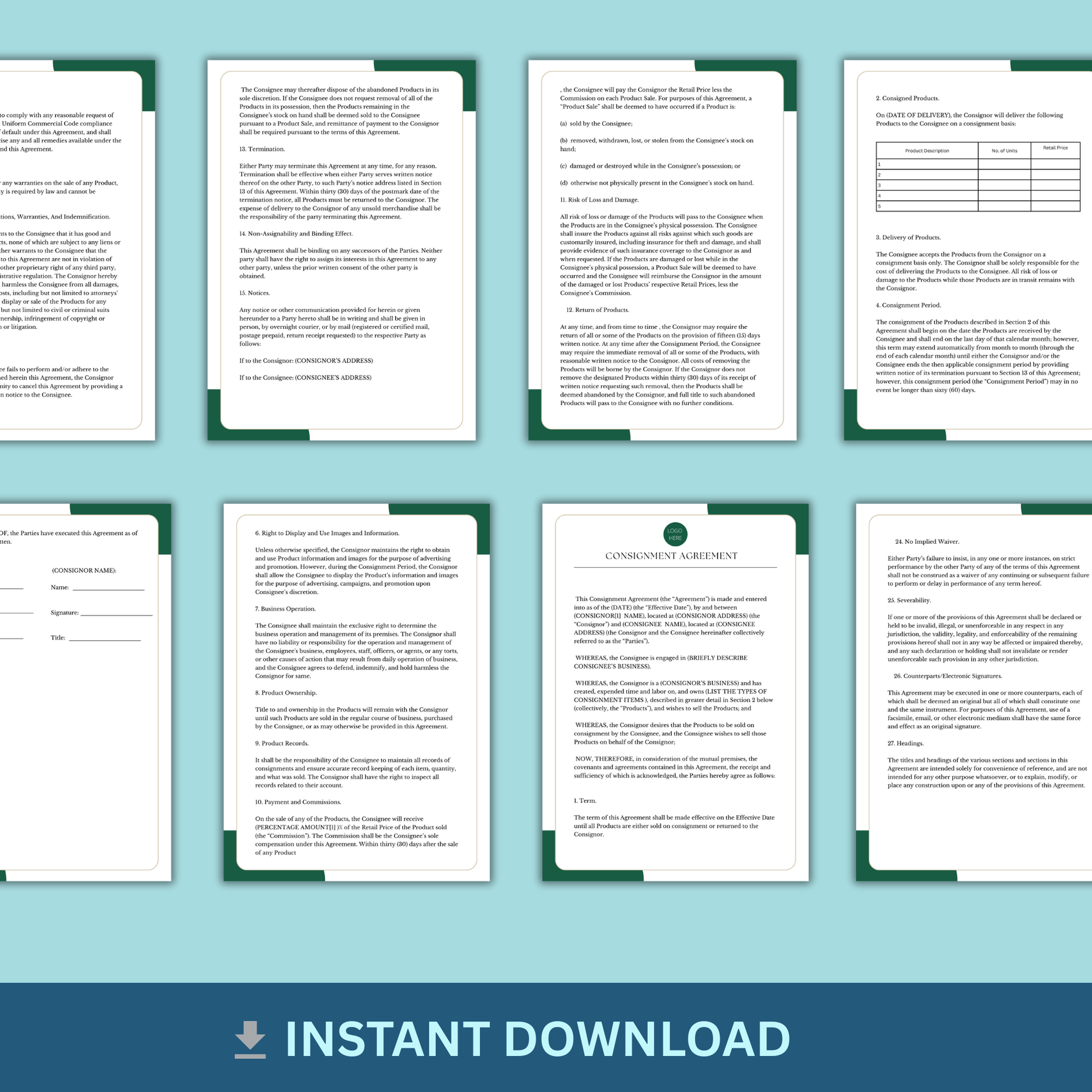 This Consignment Agreement is a contract between two parties, typically a consignor and a consignee, which outlines the terms of sale for the goods. This Agreement focuses on the duration, pricing, payment terms, delivery, product ownership, liability and more…