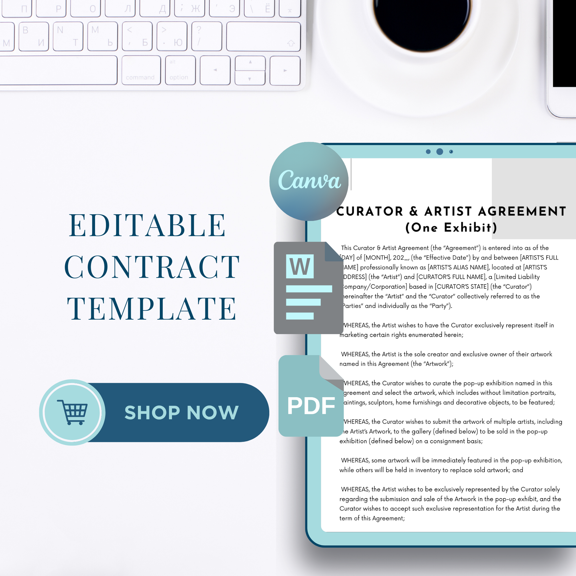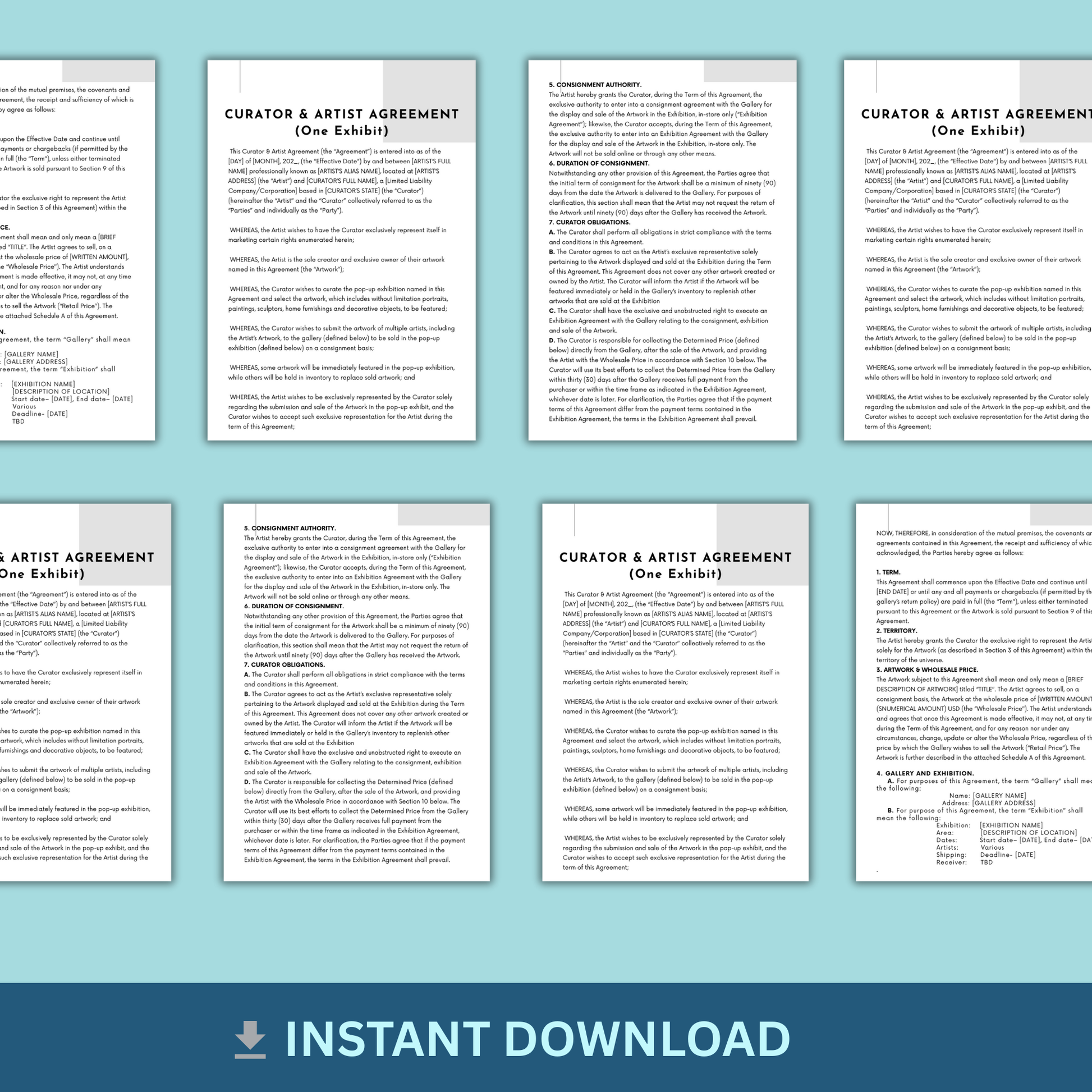 This Curator and Artist Agreement outlines the roles and expectations for both the artist and the curator. This Agreement addresses issues like exhibit duration, compensation, responsibilities, titles, and intellectual property to facilitate a seamless collaboration.