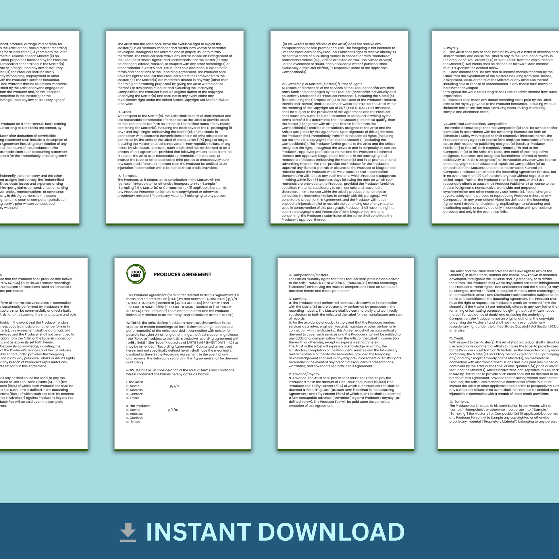 This Music Producer Agreement outlines the terms between the producer and the artist. This Agreement covers key areas such as advances, royalties, obligations, credits, copyright ownership and more...