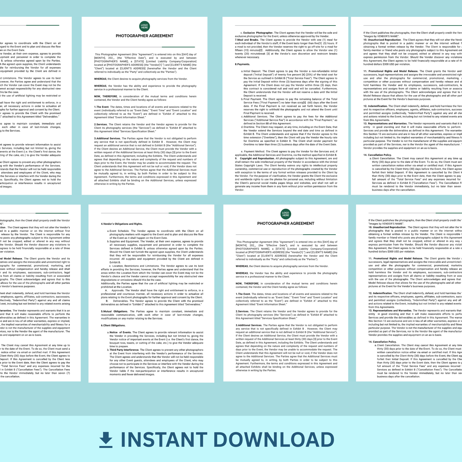 Are you a photographer and need a solid contract to solidify your next gig? Get started with this Agreement.