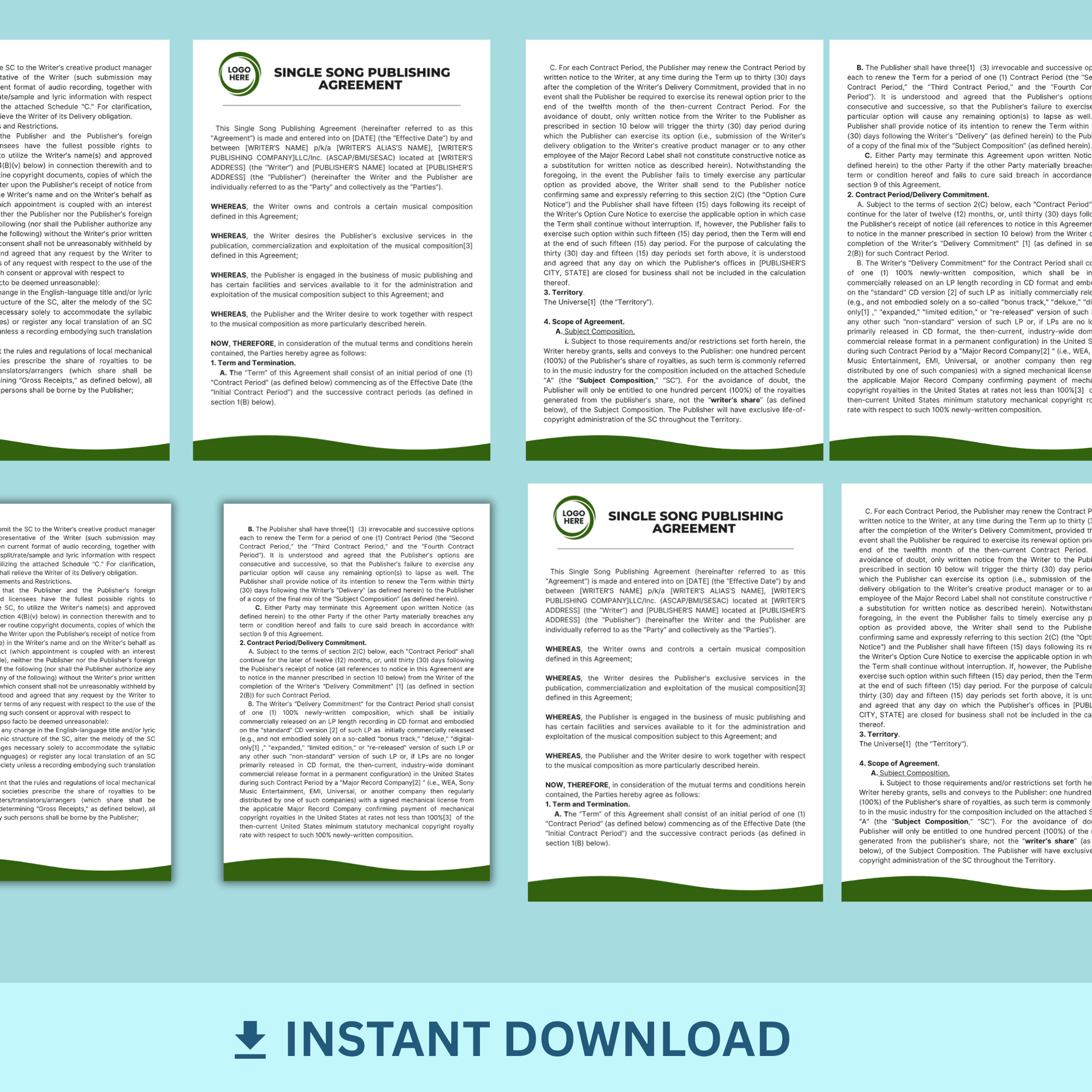 This Single Song Agreement is a legally binding contract between a songwriter and a music publisher or record label. This Agreement covers key provisions such as advances, services, duration, delivery commitment, territory, credits, division of income and more...