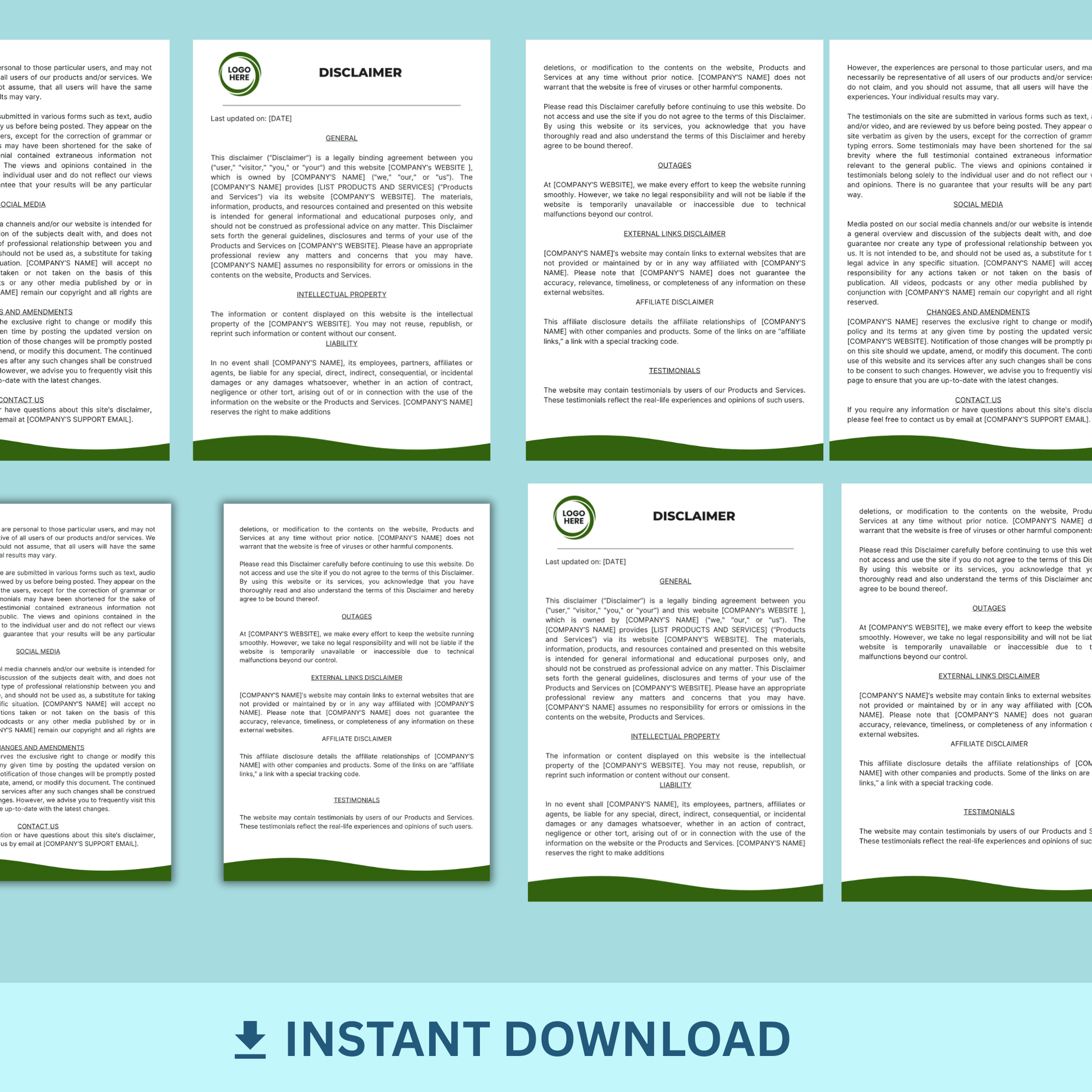 This Disclaimer is a key component to protecting your website from liability of its users. This Disclaimer includes a general notice and clarifies key areas such as intellectual property, liability, external links, testimonials, social media and more.